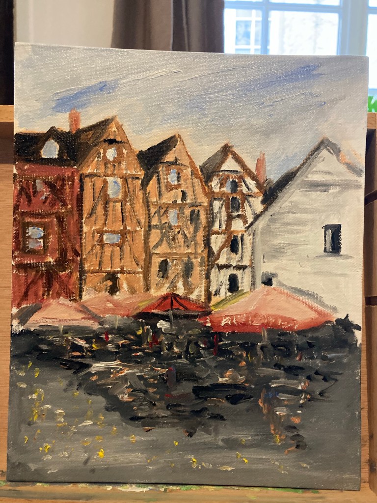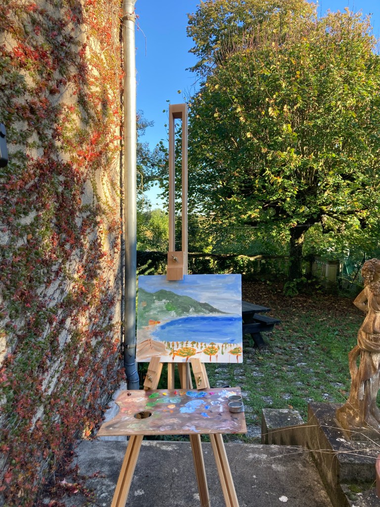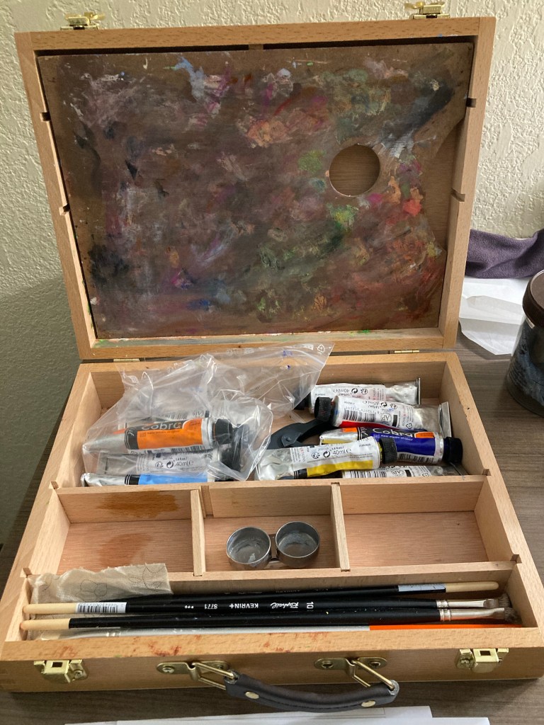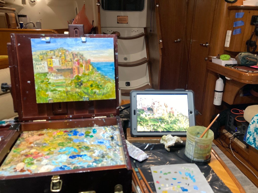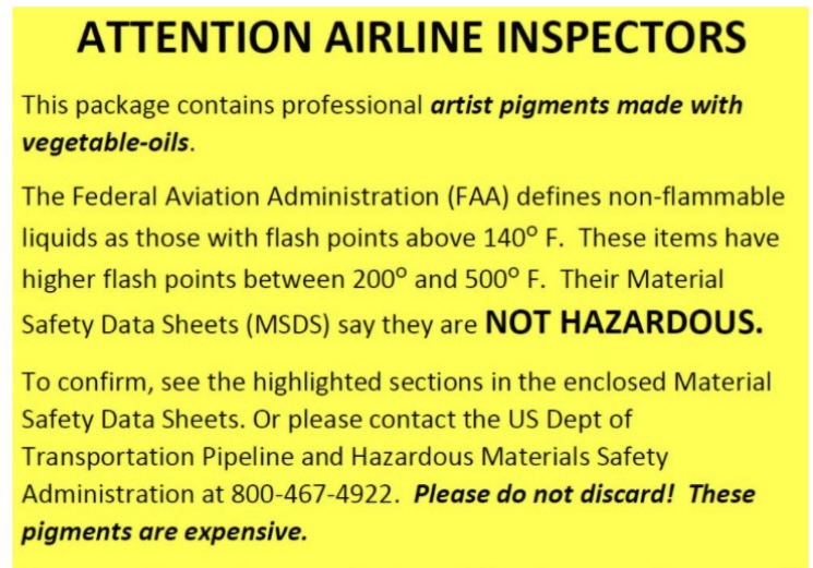 We spent some time researching how to bring the paints and paintings back with us while flying. Oil paints can be considered to be flammable and prohibited. The paints I have are special oil/water types that have a very high flash point so not flammable. We created special info sheets for security inspectors about flash points of the paints as some google searches said it was tricky to fly with paints. Amazing two security checkpoints later and careful analysis it appears that “ art materials” can somewhat exceed bathroom tubes and have more options.