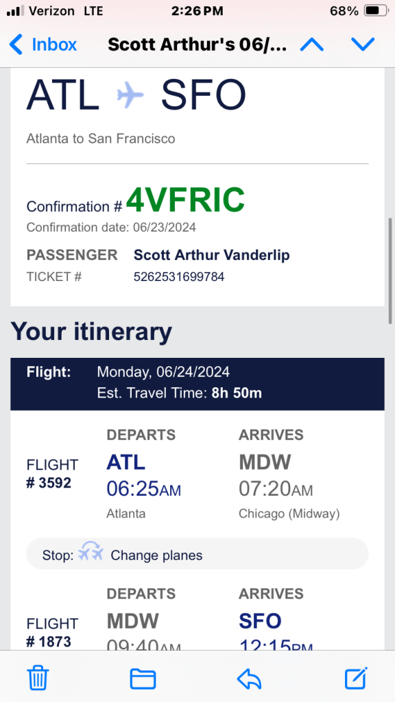 It was an adventure getting back to California using some generous buddy / standby passes from a sailing friend who is a pilot. This was our first time to try and use free flights and it took about 13 hours of getting on a set of flights to go from Atlanta thru Chicago.
